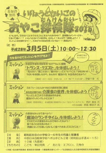 こちらも去年に引き続き行われえます、中部自動車学校で行われます「いりょうとかいごのおやこ体験隊」です。実際に高齢者になったような体を体験したり、介護職を味わったりできるコーナーもあります。当院訪問栄養士西澤貴志さんが協力参加しております。要予約ですのでお早めに。